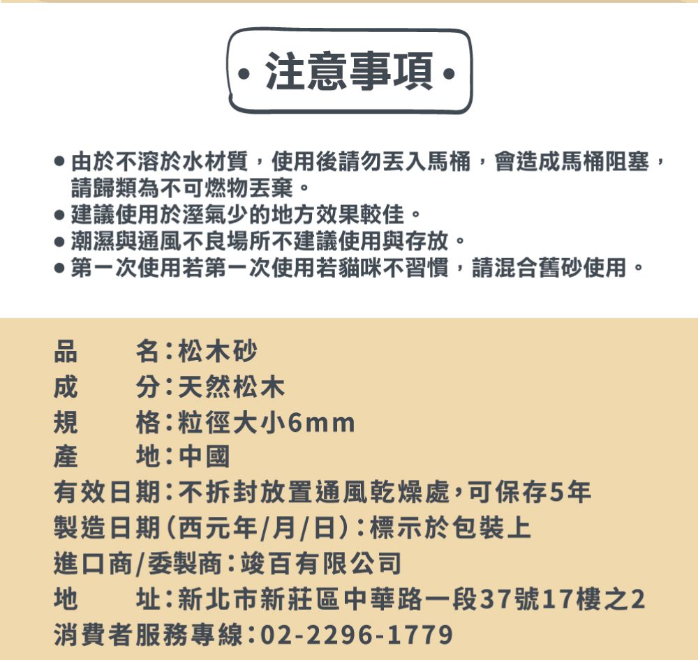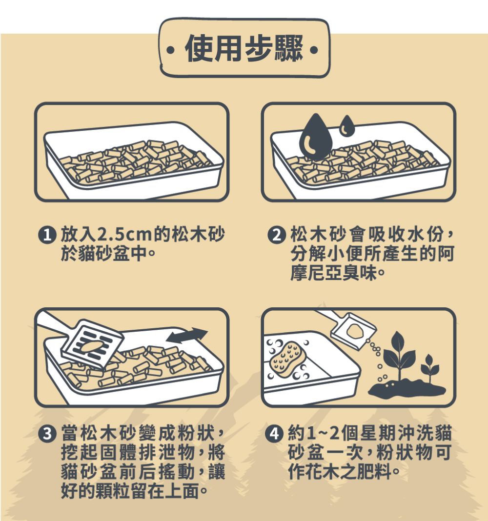 ※ 建議使用雙層貓砂盆,因松木砂遇水後會化成粉末,崩解後木屑會掉落到下層方便集中清潔。